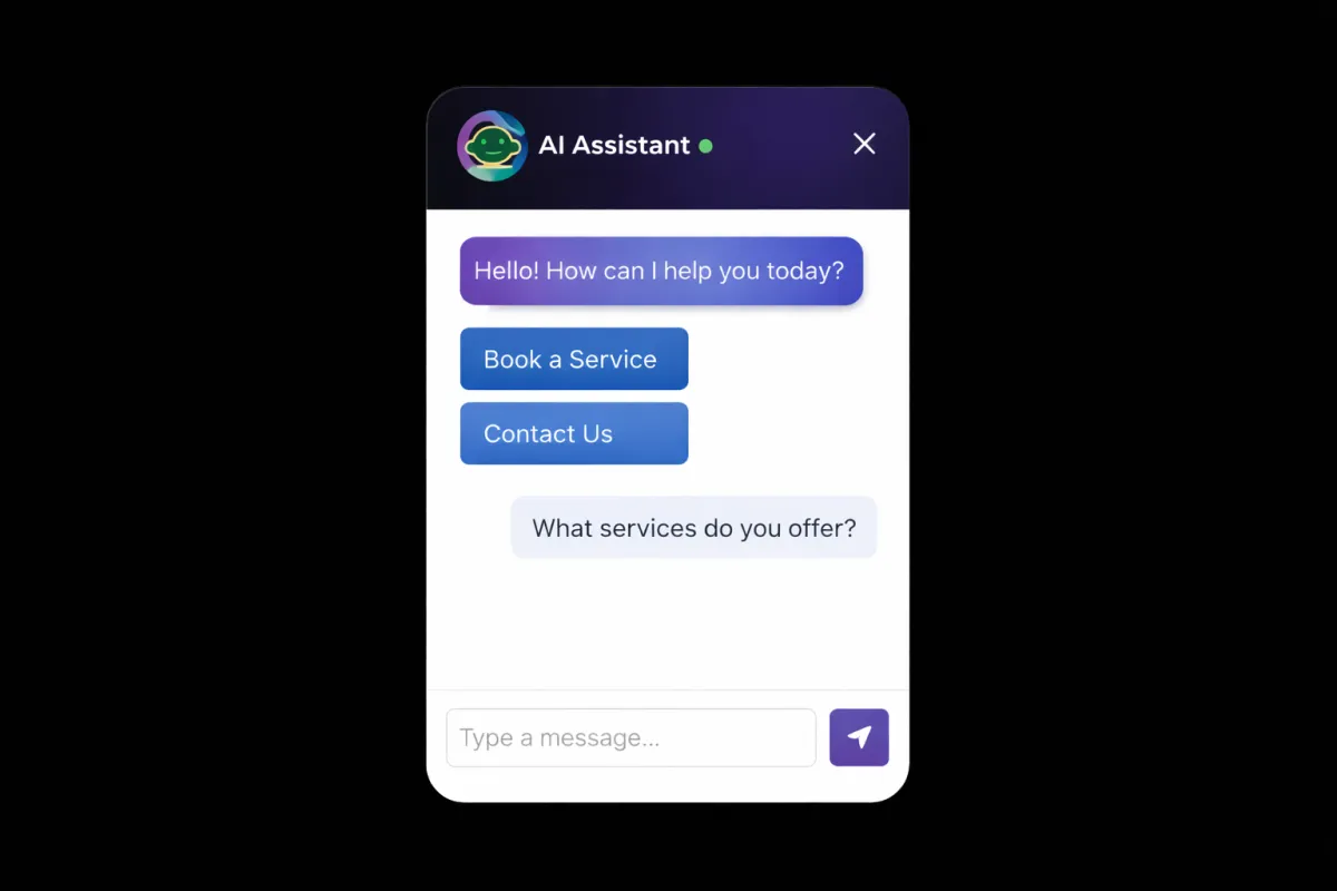 Your AI assistant responds instantly to website enquiries 24/7. It answers FAQs, captures contact details, and directs prospects toward booking or contacting your business.